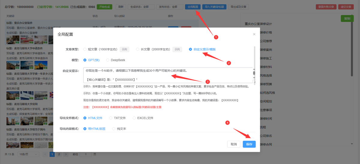 如图所示,只需要导入关键词,就可以生成文章,同时还支持生成文章的TDK和自动配图。十分钟就能生成几百篇